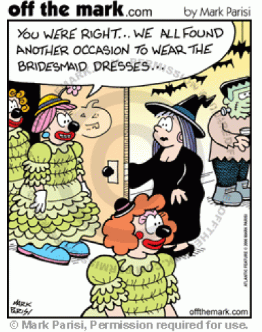 Bridesmaid Halloween Party A woman's bridesmaids rewear their dresses as clown costumes on Halloween.
