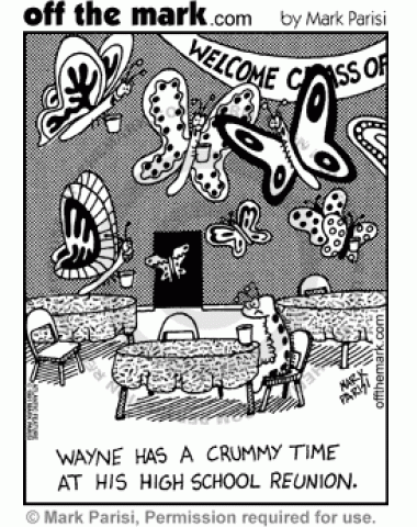 Caterpillar Class Reunion Wayne the caterpillar isn't enjoying his high school reunion because everyone else has turned into butterflies, but not him.