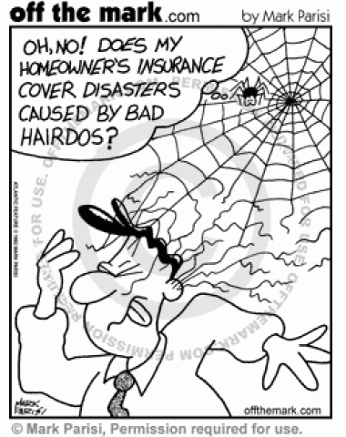 Spider Web Disaster Spider is upset because her web is ruined by man's hair, and she wonders if her homeowner's insurance covers bad hair-do disasters.