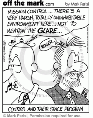 Cooties Space Mission Cootie, sitting on a bald man's head, radios to mission control, located on a full head of hair, about unhospitable environment, including a harsh glare.