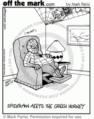 Spiderman meets the Green Hornet and eats him.
