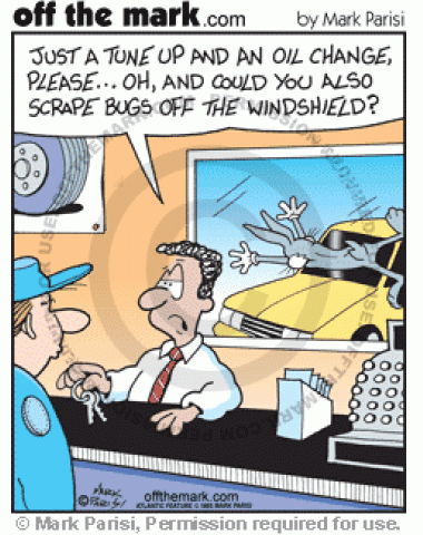 Auto Maintenance A man takes his car in for an oil change and asks them to clean the Bugs Bunny off the windshield.