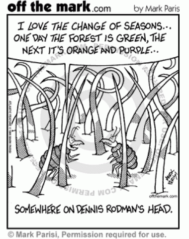 Two lice think Dennis Rodman's hair dye changes are the seasons