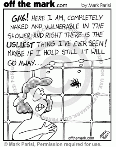 A spider and a woman in the shower each think the other is the ugliest thing ever.