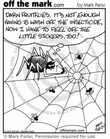 A spider doesn't like having to wash insecticide and peel stickers off fruitflies.