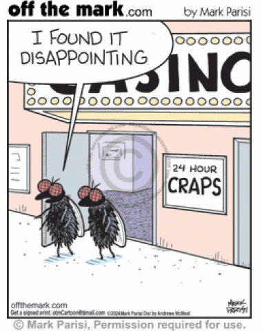 Gross fly bugs find Vegas 24-hour crap game casinos disappointing misunderstanding.