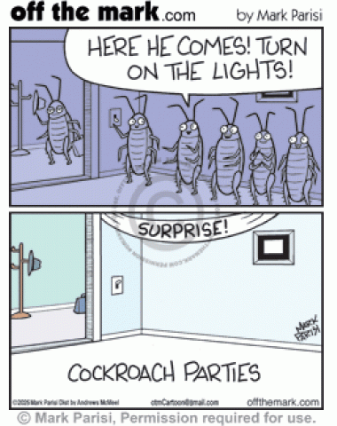 Roach friends at bug surprise party hide when light turns on.