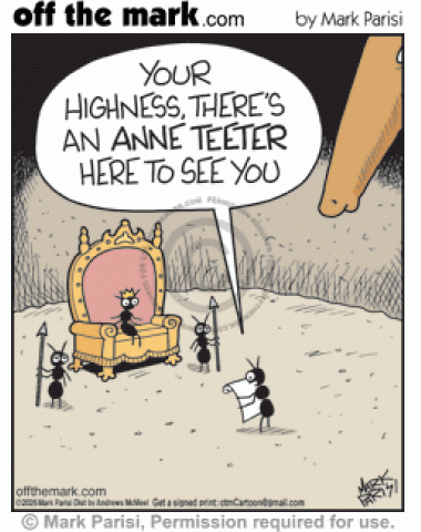 Royal guard insect announces dangerous ant eater visitor named Anne Teeter to crowned anthill ruler on throne.