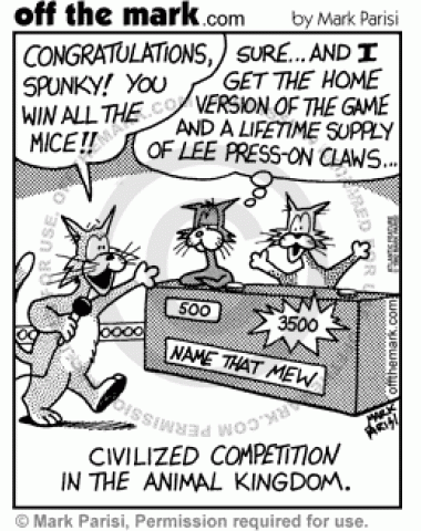 Two cats on game show, and Spunky wins all the mice, while competitor leaves with lifetime supply of press-on claws and home version of game.