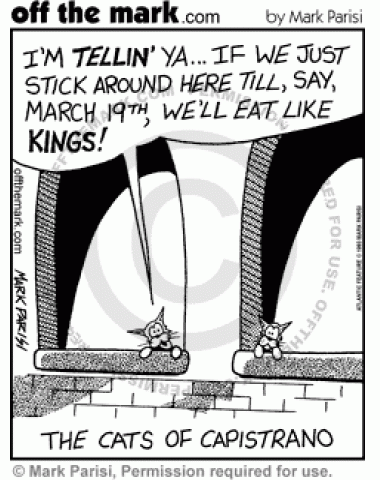 Cats in Capistrano wait for the cat-feeding holiday.