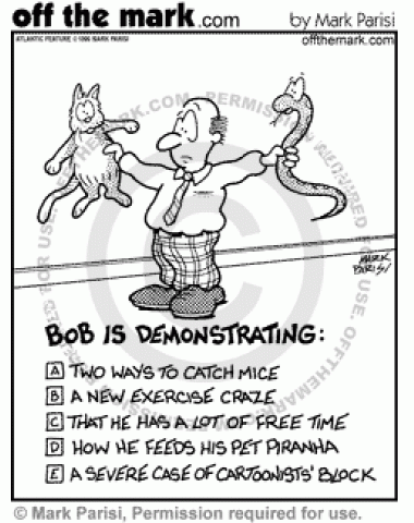 Cartoonist's Block A man holds a bird and a snake, maybe because demonstrating how to catch mice but probably because he's run out of ideas for cartoons.
