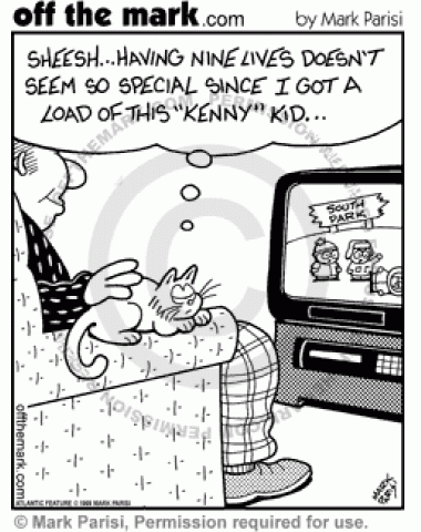 Cat Watches South Park A cat feels like having 9 lives isn't special after seeing how many lives Kenny has on South Park.