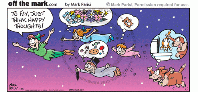 Flying Happy Thoughts To fly, a dog thinks happy thoughts about giving the cat a swirlie.