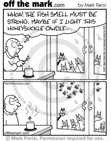 Cats attracted by fish smell prompt man to light candle that attracts bees.