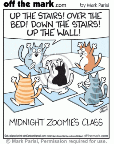 Frisky Cats Midnight Zoomies Exercise Class Late night cat zoomie aerobic class exercises wild racing around house workout.