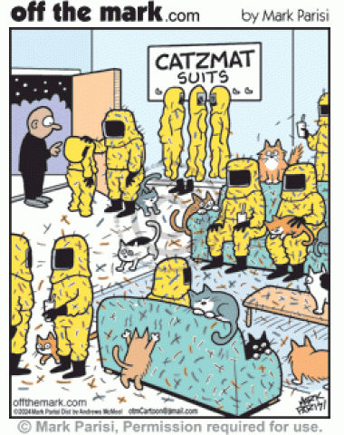 Hairy House Party Catzmat Shedding Cats Protection Guests wear protective pet hair hazmat suits in multiple cat shed fur covered home.