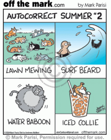 Autocorrect Summer #2 Law Mewing Cats, Surf Beard Wave, Water Baboon & Ice Collie Coffee Autocorrected summertime texts fixes lawn mowing cats meowing, ocean surf facial hair, inflated water balloon monkey & iced coffee collie dog drink cup.