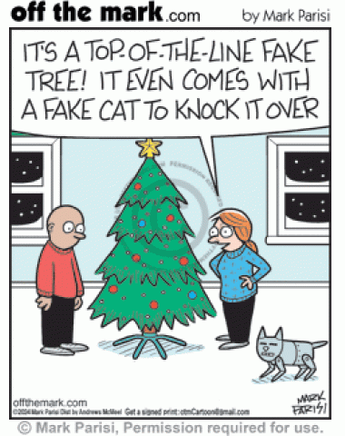 Top-of-the-Line Fake Xmas Tree Has Fake Cat Mischief Top of the line artificial Christmas tree comes with robot cat to knock it over.