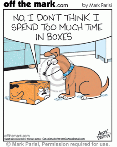 Cubed Cat In Boxes Too Much Annoyed kitty squished in square cube shape tells worried dog it doesn’t spend too much time in boxes.