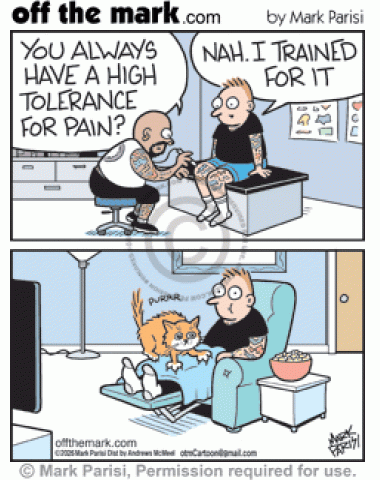 Cat Claw Love Biscuits Tattoos Pain Training Tattoo artist tattooing full body tattooed guy’s legs asks if he’s always had high pain tolerance but he trained with pet kitty kneading lap affectionately.