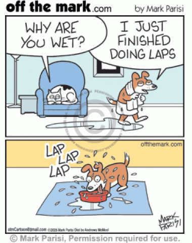 Soggy Swimmer Dog Drinks Laps Pet cat asks soaked dog in towels why he’s wet & answers he finished laps, water lapped from bowl.