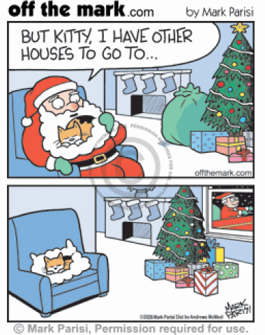 Santa Left Beard Behind For Cozy Cat Santa Claus trapped by napping kitty curled up on beard leaves facial hair to deliver toys.