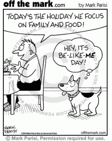 Family and Food A dog thinks Thanksgiving is a day to act like him because his family is focusing on family and food.