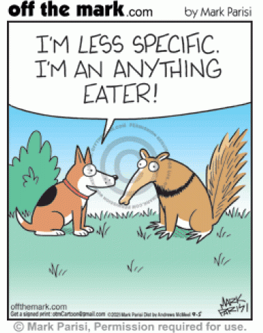 Dog tells finicky anteater that he is less specific, he’s an anything eater.