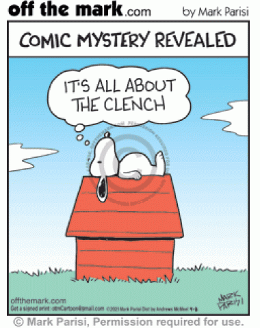 Comic Mystery Revealed Snoopy’s Doghouse Roof Butt Clench Peanuts cartoon Snoopy clenches his ass cheeks to lay on sharp dog house rooftop.