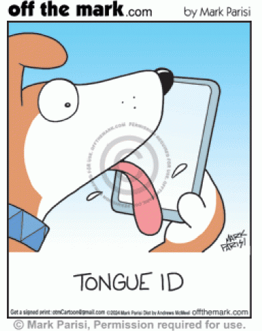 Dog licks smartphone touchscreen to unlock phone’s secure tongue identity password protection.