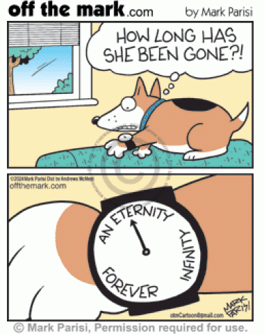 Anxious Dog’s Watch Times Eternity Owner Gone Pet dog waiting anxiously for owner’s return home wears watch timing forever, infinity & an eternity.