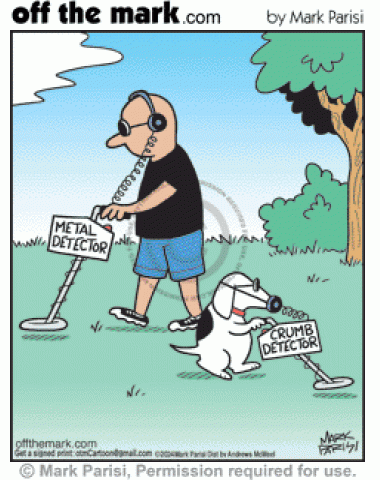 Canine Crumb Detector Sniffs For Food Pet dog & owner search grass with crumb & metal detectors together for buried underground finds.