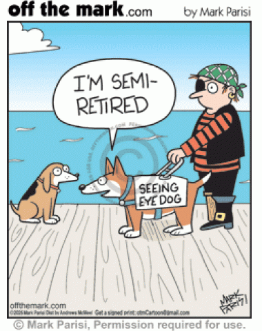 Semiretired Guide Dog Helps One Eye Pirate Seeing eye dog guiding one-eyed pirate in eyepatch says it’s semi-retired.