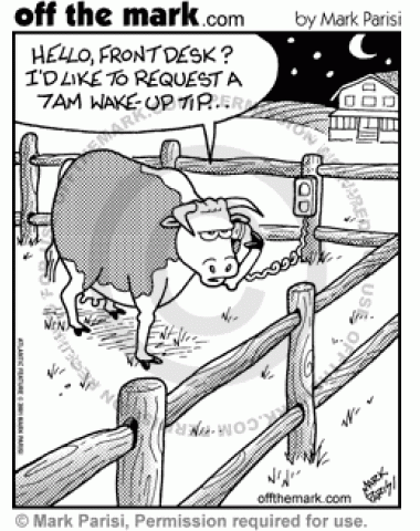 Cow Wake Up Tip A cow asks for a wake-up tip.