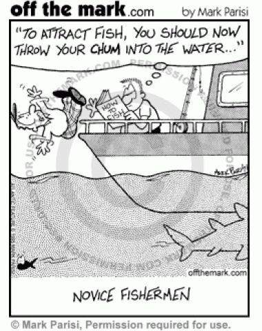 Novice Fishermen A man throws his friend into the water because he thinks a chum will attract fish.