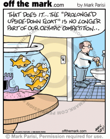Goldfish take the "Prolonged Upside-Down Float" out of their Olympic competition after their owner flushes one of them.
