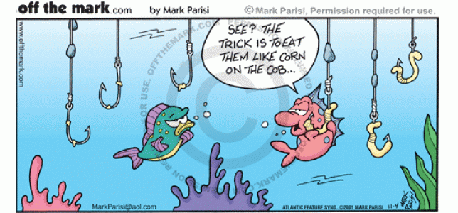 Fish Corn on Cob A fish avoids getting hooked by eating the worms like corn on the cob.