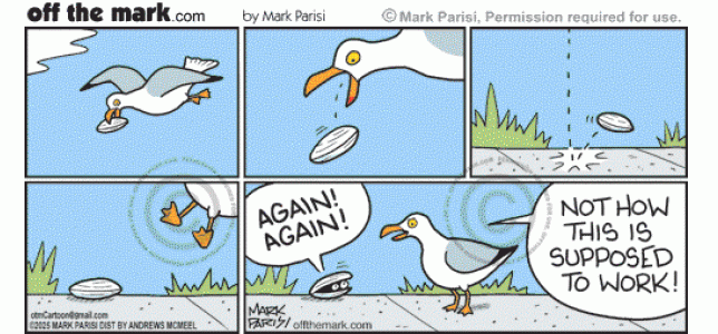Frustrated seagull drops shellfish on pavement to break but bouncing oyster enjoys falling ride.