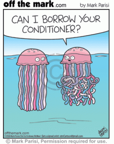 Tendril Tangle Jellyfish Borrows Conditioner Tangled tendrils jelly fish twisted in messy knots asks to borrow detangling hair conditioner.
