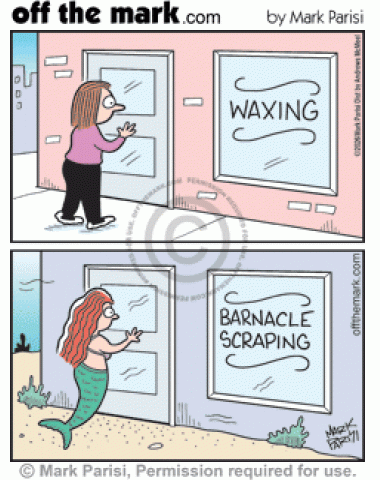 Lady visits body hair waxing salon while mermaid has fin barnacles scraped undersea.