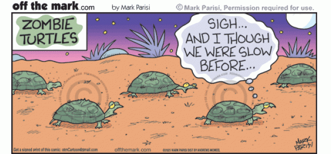 Impatient slowly walking dead turtle zombies thought they were slow when alive.