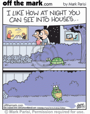Person walking at night says he likes seeing inside house windows, worrying embarrassed tortoise naked in shell home.