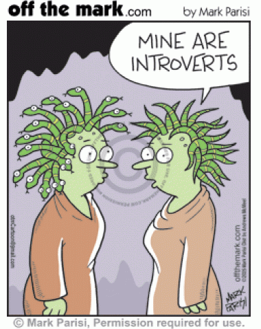 Medusa with snake tail hairs hiding faces in head says they are introverts.