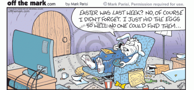 Easter Bunny's Excuse The Easter Bunny forgets about Easter and claims he hid the eggs really well.