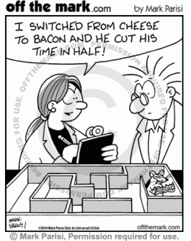 A mouse in a maze goes faster when he's rewarded with bacon instead of cheese.