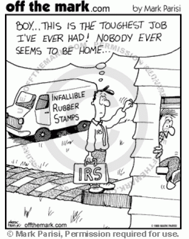 Salesperson for IRS stamp company can't ever find anyone at home.</p>