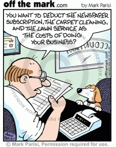 A dog tells accountant to deduct the cost of "doing business" on his taxes.