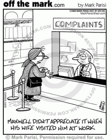 Husband Complaints Department Wife visits husband who works at complaint department.