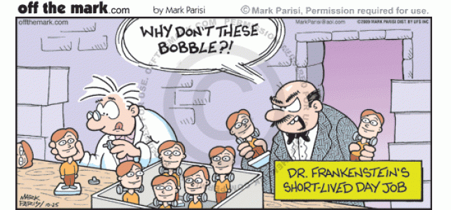 Adding bolts to the necks of bobbleheads gets Dr. Frankenstein fired from his day job.