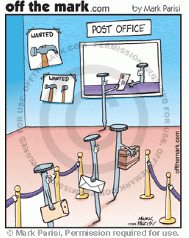 At the post office for nails, hammers are in the most wanted posters.</p>